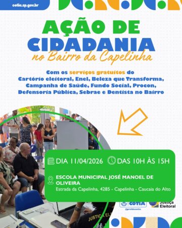 Moradores do bairro Capelinha, em Caucaia do Alto, recebem no próximo dia 11 de abril uma ação integrada de cidadania que reúne serviços da Justiça Eleitoral e da Prefeitura de Cotia. A iniciativa acontece das 10h às 15h, na Escola Municipal José Manuel de Oliveira (Estrada da Capelinha, 4285) e tem como foco ampliar o acesso da população a atendimentos essenciais, especialmente em uma região marcada pela vulnerabilidade social e pela dificuldade de acesso a serviços públicos.