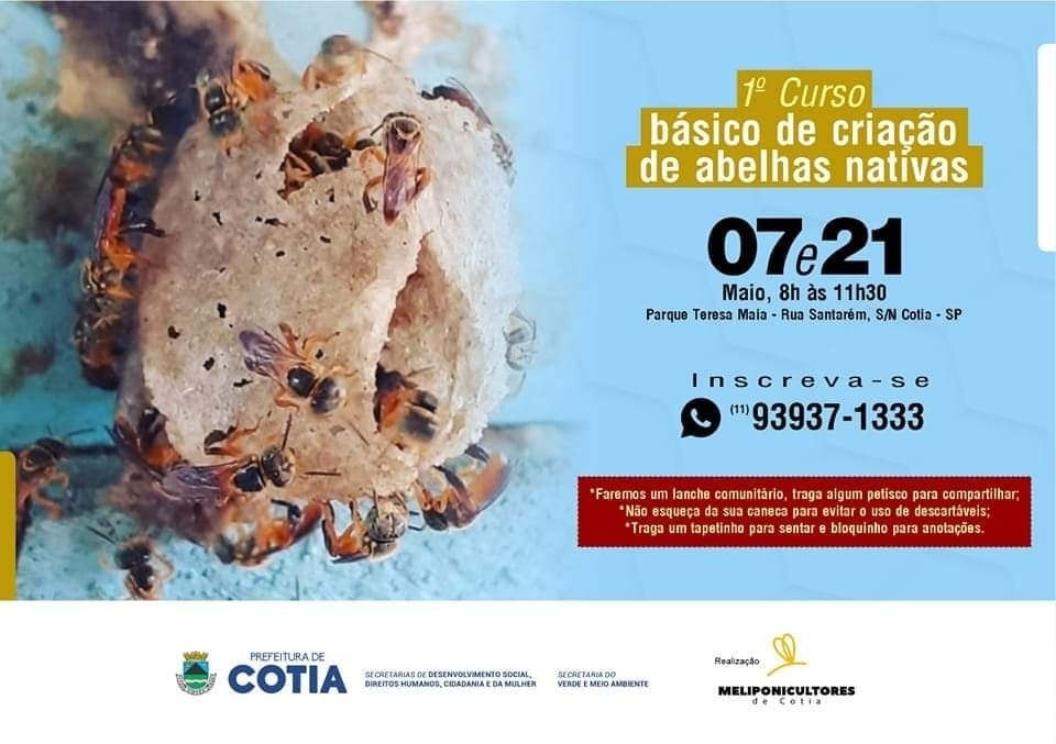 Estão abertas as inscrições para o 1º Curso Básico de Criação de Abelhas Nativas que acontecerá nos dias 7 e 21 de maio, no Parque Teresa Maia, rua Felipe Paltronieri (antiga rua Santarém), região da Granja Viana. Os interessados devem se inscrever pelo Whatsapp 11 9 3937-1333. O curso está dividido em dois módulos com duração de três horas e meia cada, totalizando sete horas. As aulas acontecerão sempre das 8h às 11h30. O curso está sendo oferecido por meio de uma parceria entre as Secretarias dos Direitos Humanos, Cidadania e da Mulher e do Verde e do Meio Ambiente de Cotia e o Meliponicultores de Cotia.