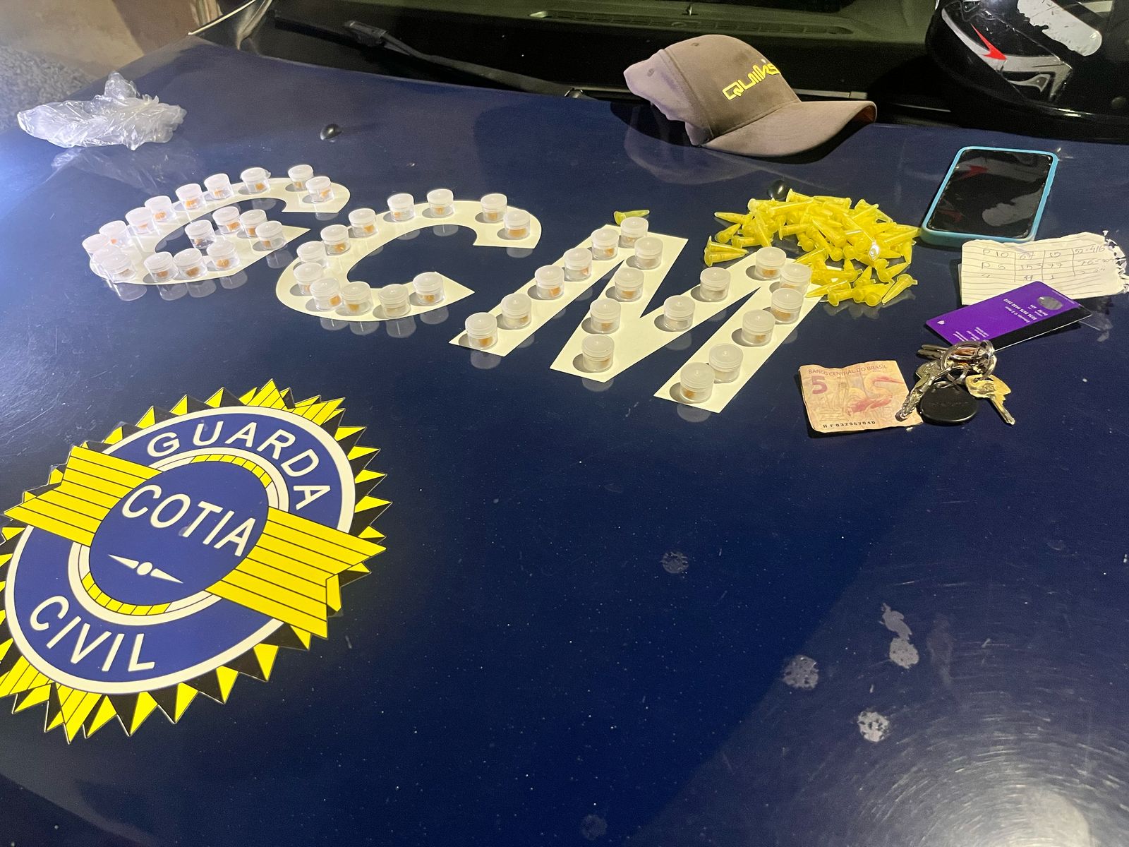 Em uma ação de patrulhamento, na madrugada do último sábado (22/03), a Guarda Civil Municipal de Cotia (GCM) apreendeu 115 frascos com material amarelado (confirmado como crack pelo Instituto de Criminalística de Taboão da Serra) que seria comercializado no tráfico de entorpecentes e prendeu o homem que transportava o material. A abordagem aconteceu no Jardim Santana e o homem confessou que comercializaria a droga no próprio bairro. Uma motocicleta também foi apreendida.