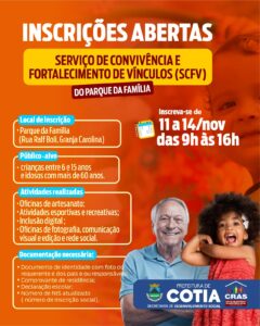 Cotia tem inscrições abertas para atividades do Serviços de Convivência e Fortalecimento de Vínculos 07/11/2024
